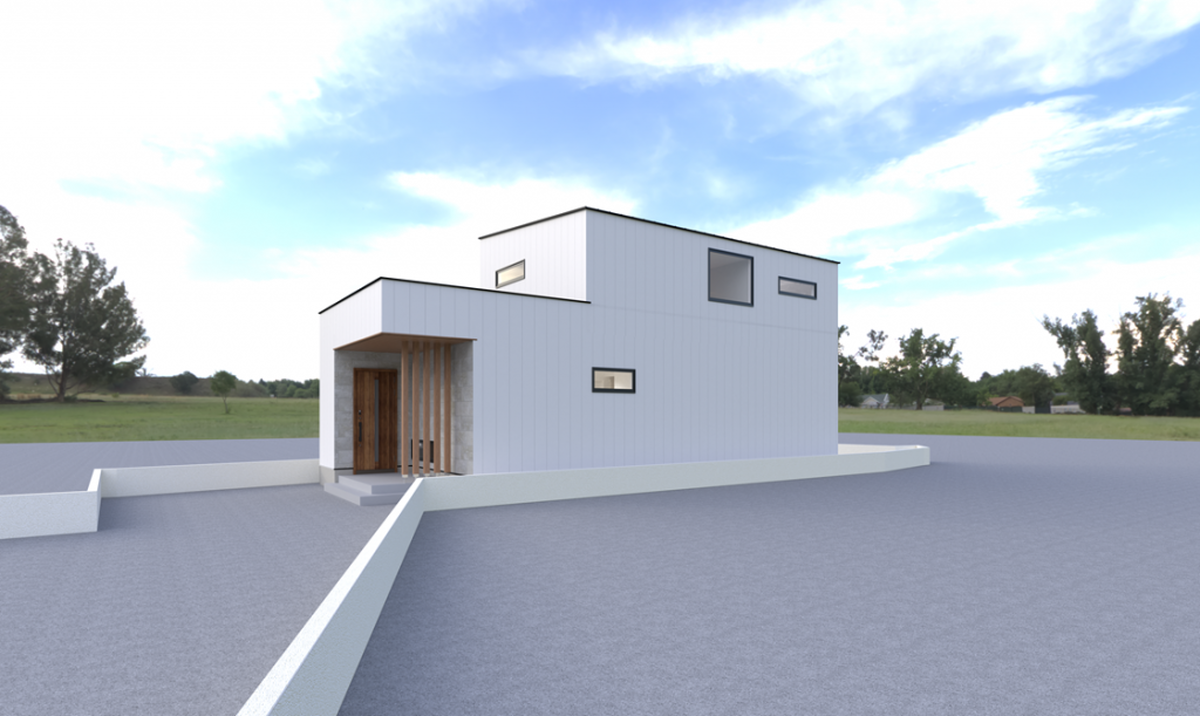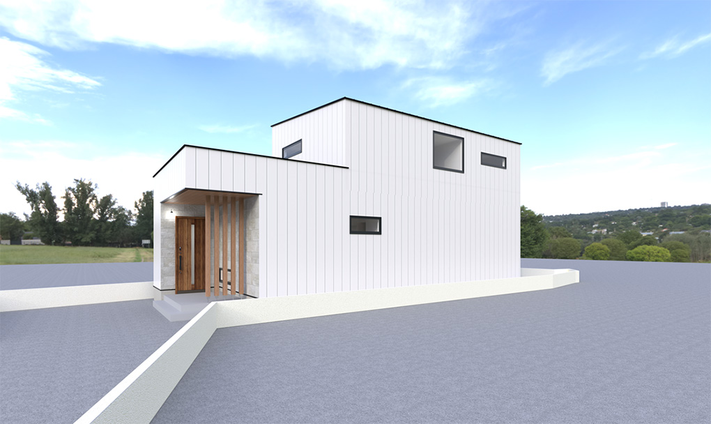 ガルバリウム鋼板のすっきりとした外観に、玄関まわりのソリド貼りと木張りの軒天がアクセント。