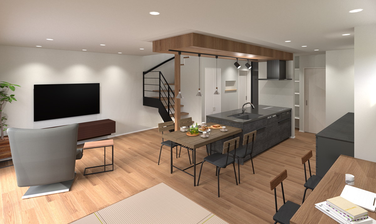 木目調クロスの折り下げ天井が空間に奥行きを与え、ダイニングとキッチンをゆるやかにゾーニング。