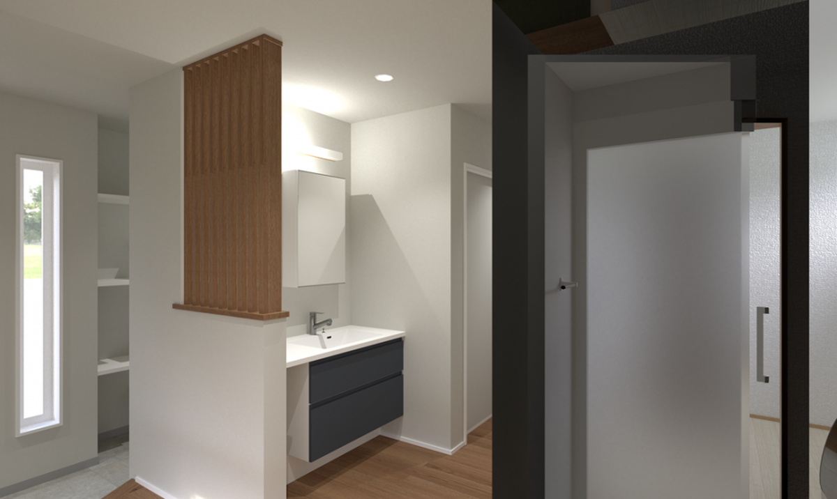 洗面スペースは、シンプルなデザインの中に木格子を取り入れ、さりげないアクセントに。
